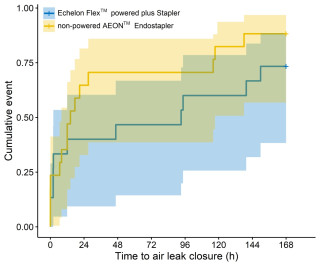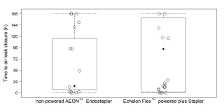 Immediate postoperative air leaks were observed in 6 of 17 procedures (35.3%) using the non-powered and in 9 of 15 procedures (60%) performed with the powered stapler. The median time to closure of the air leak was considerably shorter in the non-powered procedures: 14.3 hours [6.7, 116] compared to 93.2 hours [2.1, 159] for the powered treatments (Figure 1.). Cox regression analysis yielded a Hazard ratio of 1.6 (95% CI: 0.73-3.3) for a faster air leak closure with the non-powered stapler (P = 0.25) (Figure 2.).