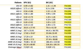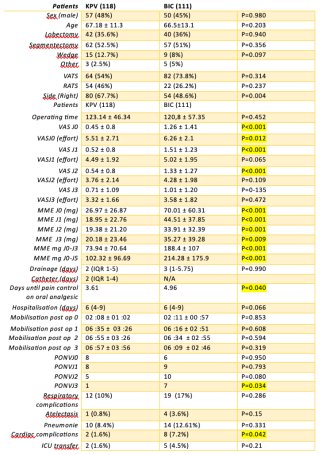 Of 229 patients undergoing lung resection (82 lobectomies, 119 segmentectomies, 24 wedge) via VATS or RATS, 118 received KPV and 111 BIC. KPV significantly reduced resting pain (POD 0-2) and opioid consumption (73.9 vs 188.4 mg MME, p < 0.001) over the first three days, differences persisting to day 5 (table1). In matched cohorts (61 patients/group, table 2), KPV provided superior resting analgesia (POD 0-3, P<0.001; P=0.013) and reduced pain on effort (POD 1, P=0.006). Cumulative opioid consumption (J0–J5) was significantly lower with KPV (93.2 vs 218.3 mg MME, P<0.001). KPV also facilitated earlier transition to oral analgesia (P=0.04) and was linked to fewer cardiac complications (P=0.042), despite 10.7% catheter dislocation.