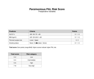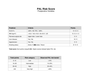 Air leak (PAL) is the most common complication after segmentectomy and prolongs drainage and hospital stay. No bedside risk tool exists specifically for uniportal segmentectomy.
