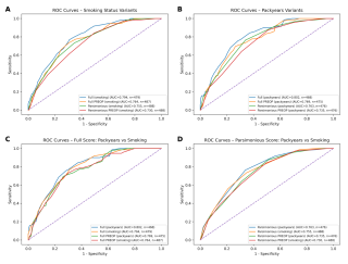 A total of 575 uniportal segmentectomies were included. Multivariable analysis identified upper lobe location, reduced diffusion capacity (lower DLCO%), low BMI, hypertension, liver disease, long surgery time, and additional wedge resection from another segment as independent predictors of PAL. Elastic net modeling confirmed these variables as the most informative, achieving ~70% classification accuracy and supporting translation into point-based scores. Using smoking status instead of pack-years, the weighted full score showed good discriminatory power (AUC 0.794). The parsimonious bedside score (0–2 points/item) achieved an AUC of 0.755. (Fig.1 and 2) Modeling smoking as pack-years provided only minimal improvement (ΔAUC ≈ +0.01). Restricting prediction to preoperative variables led to a modest reduction in performance (complete preoperative AUC 0.764; parsimonious preoperative AUC 0.730) approximately 0.03 AUC lower than the corresponding full models. (Fig.3) Observed PAL rates increased stepwise across risk categories, with good calibration and no major miscalibration in the intermediate-risk range.