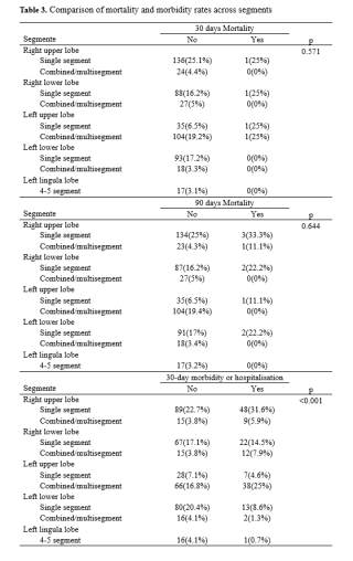 A total of 189 patients were included; all underwent post-removal CXR. The cohort was predominantly male (66.1%), with high comorbidity (ASA 3-4: 82%); 20.1% had COPD, and 40.7% were active smokers. Median time to chest tube removal was 1 day [1–2] and median length of stay was 2 days [2–3]. Post-removal CXR was abnormal in 55.7% of the cohort, most commonly showing pleural effusion (41.3%) or pneumothorax (30.7%);