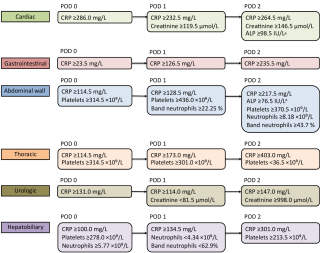 Parameters from the preoperative (age, sex, American Society of Anesthesiologists (ASA) score, comorbidities) and intraoperative (surgery duration, emergency status, ICU transfer, antibiotic administration) phases were used to define baseline characteristics. A total of 6 postoperative laboratory markers were selected in the predictive models according to imputation performance. The primary outcome was the occurrence of any postoperative bacterial infection. The predictive model was designed to determine which laboratory tests, including their optimal thresholds, should be performed on which specific postoperative day (POD), tailored to defined surgical procedure groups.
