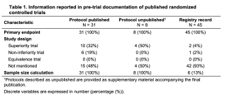 We identified 87 published RCTs. Pre-trial documents were available for 84(98%) trials; all defined a primary endpoint, but only 23(27%) reported the study design. Among the final publications, 20(23%) trials specified an aim to show superiority with a corresponding study design and 12(14%) a non-inferiority aim and design. The remaining 55 trials did not report a study aim but were basically designed and conducted as superiority trials. Sample size calculations were provided in 84(98%) trials, and 44(51%) achieved statistical significance for their primary endpoint. Of these, only 9(20%) interpreted their results from a clinical perspective.