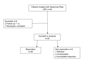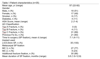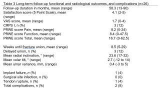 A total of 35 patients (Table 1) met the inclusion criteria, with 26 patients available for long-term follow-up (Table 2). The average age was 57 years (range 22–92) and 89% of fractures were classified as AO type C. The SP was removed on average 3.8 months postoperatively. The mean follow-up period was 58.3 months (range 13–90 months). Radiological fracture union was achieved in all patients with a mean time to union of 8.5 weeks. Complications included one implant failure due to renewed trauma and one Extensor Pollicis Longus (EPL) rupture in a patient where the tendon was not superficialized. There were no cases of surgical site infection. The mean satisfaction score was 4.1 (range 2–5) and the mean Visual Analog Scale (VAS) for resting pain was 1.7. The mean PRWE score was 16.7 (Table 3).