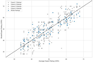 (1) Several DBM were found to be indicative of surgical performance. Measures based on tool path length and time per activity showed strong correlations with expert ratings, reaching coefficients of up to 0.6. Correlation strength varied across tools and procedures. (Figure 2) (2) The predictive model achieved a mean absolute difference from the benchmark score of 3.8 on the GRS scale (range: 28–70 points), outperforming the average inter-expert difference of 4.6 points. (Figure 3)