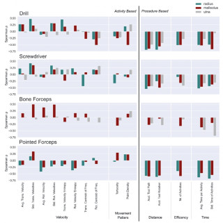 28 participants performed three standardized fracture fixations on synthetic bone models of the radius, ulna, and fibula. Tool motion was captured and transformed into a digital twin from which metrics such as path length, smoothness, and task duration were derived. (Figure 1) These metrics were statistically compared to benchmark performance scores, defined as the average of four expert ratings using the Global Rating Scale (GRS). (1) Correlation analysis identified skill-relevant metrics, and (2) a predictive model was trained to estimate performance from DBM evaluating its accuracy against the expert ratings.