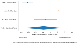 Baseline characteristics were comparable across studies regarding age, body mass index, and sex distribution. Surgeon proficiency requirements varied substantially between trials, ranging from twenty to over one hundred required previously performed procedures. Although all trials reported significant differences in operative time between approaches, only one demonstrated shorter duration with robotic surgery, resulting in a non-significant pooled estimate (MD 17.63; 95% CI −1.82 to 37.08). In total, robotic approach was associated with lower surgeon workload, although this result was not significant due to heterogeneous evidence in the individual studies (Figure 1; MD –4.50; 95% CI –16.78 to 7.78). Only one study reported significant differences in postoperative adverse events, favoring the robotic-assisted method. In summary, the complication rate did not differ significantly between laparoscopic and robotic-assisted approaches (OR 0.89, 95% CI 0.42 to 1.90).